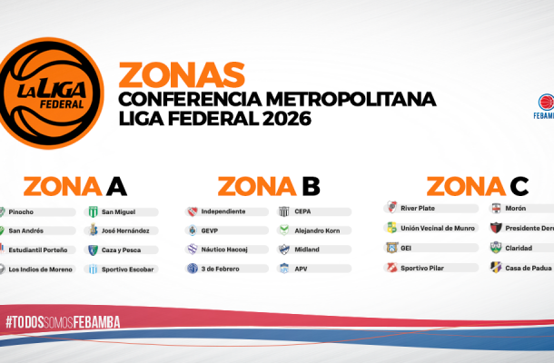 Este miércoles, 18 de febrero, en la sede de la Confederación Argentina de Básquet, se llevó a cabo el sorteo para definir los equipos que integrarán las tres zonas de la Conferencia Metropolitana para la Liga Federal 2026. El evento fue transmitido en vivo, por la señal de Básquet Pass, plataforma que transmitirá la totalidad de los partidos de la competencia.